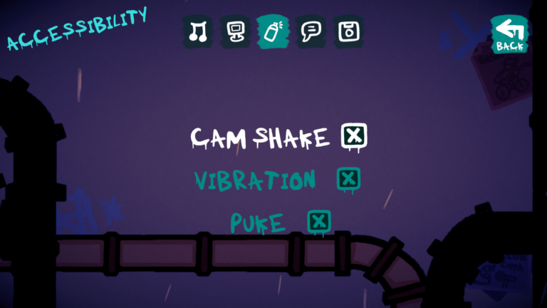 I believe we pushed for this feature after a brief discussion with a friend and fellow dev/streamer Calamity Nolan about how he favors this as an option. I think especially in a genre where players are thinking, deducing or reverse engineering solutions in their mind, having the option to toggle off cam shake to dial down the juice is the right choice. Maybe it’s not even really needed? There’s a school of thought that teaches games designers to push for ‘game feel’ and to ‘juice’ things as much as possible for impact but maybe a discussion about this is a blog post for another day!